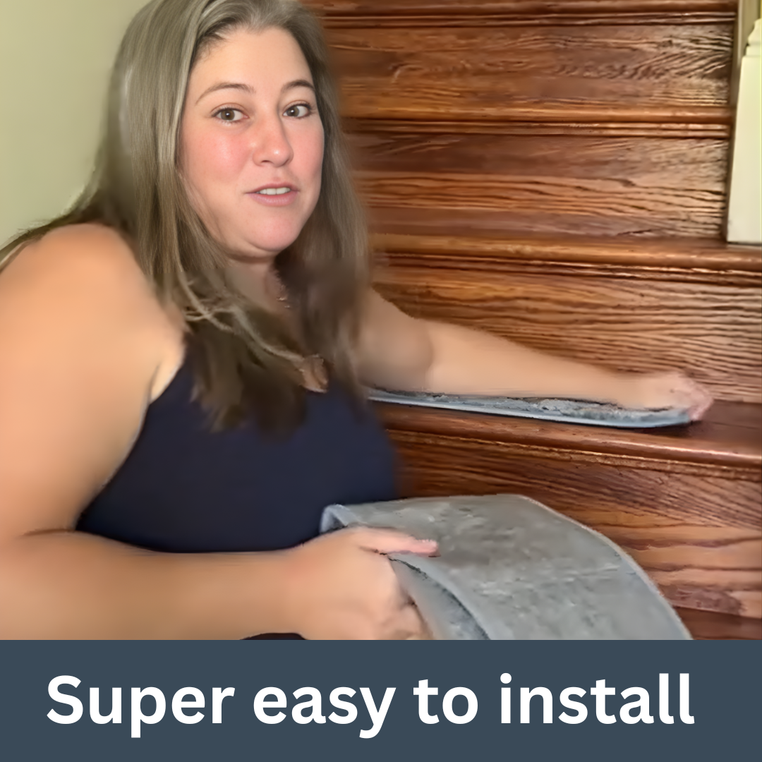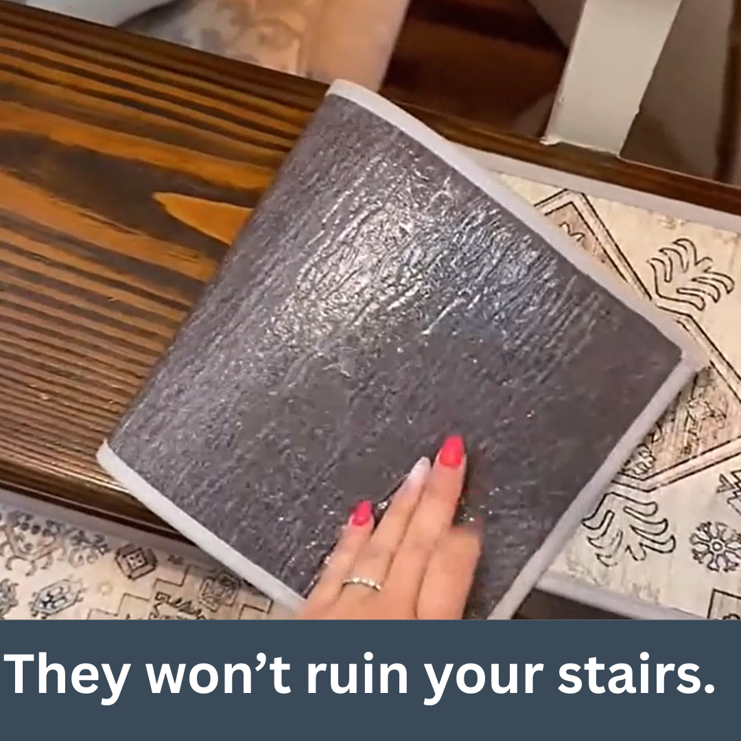 Not at all — TreadKind™ is specifically designed to protect, not damage. Our treads don’t use sticky adhesives, nails, or harsh glue. Instead, they feature a soft, non-toxic friction-based backing that grips firmly to your stairs without leaving residue or stripping the finish. When you’re ready to remove or reposition them, they lift cleanly without a trace. It’s all the grip you need, with none of the risk you don’t.